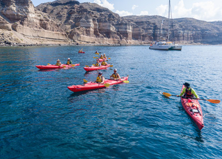 In the morning after your breakfast, depart for your tour. A guided hike paired with a delicious cooking class awaits you. We will hike and afterwards, during our cooking lesson, we will learn how to prepare a variety of delicious dishes all bursting with Mediterranean flavor. We will learn how to use homegrown ingredients and local cooking techniques. We will then savor our delicious homemade meal together! Relax for a while and in the evening depart for your Sea Kayak experience. On this sunset kayak and snorkeling adventure in Santorini, you will visit black, white, and red beaches. At the end we will enjoy a savory dinner in a traditional tavern.